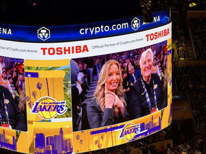 湖人新老板马克·沃尔特和珍妮·巴斯在场边观战球队的揭幕战,这是沃尔特成为湖人老板之后首次在主场观看湖人的常规赛。